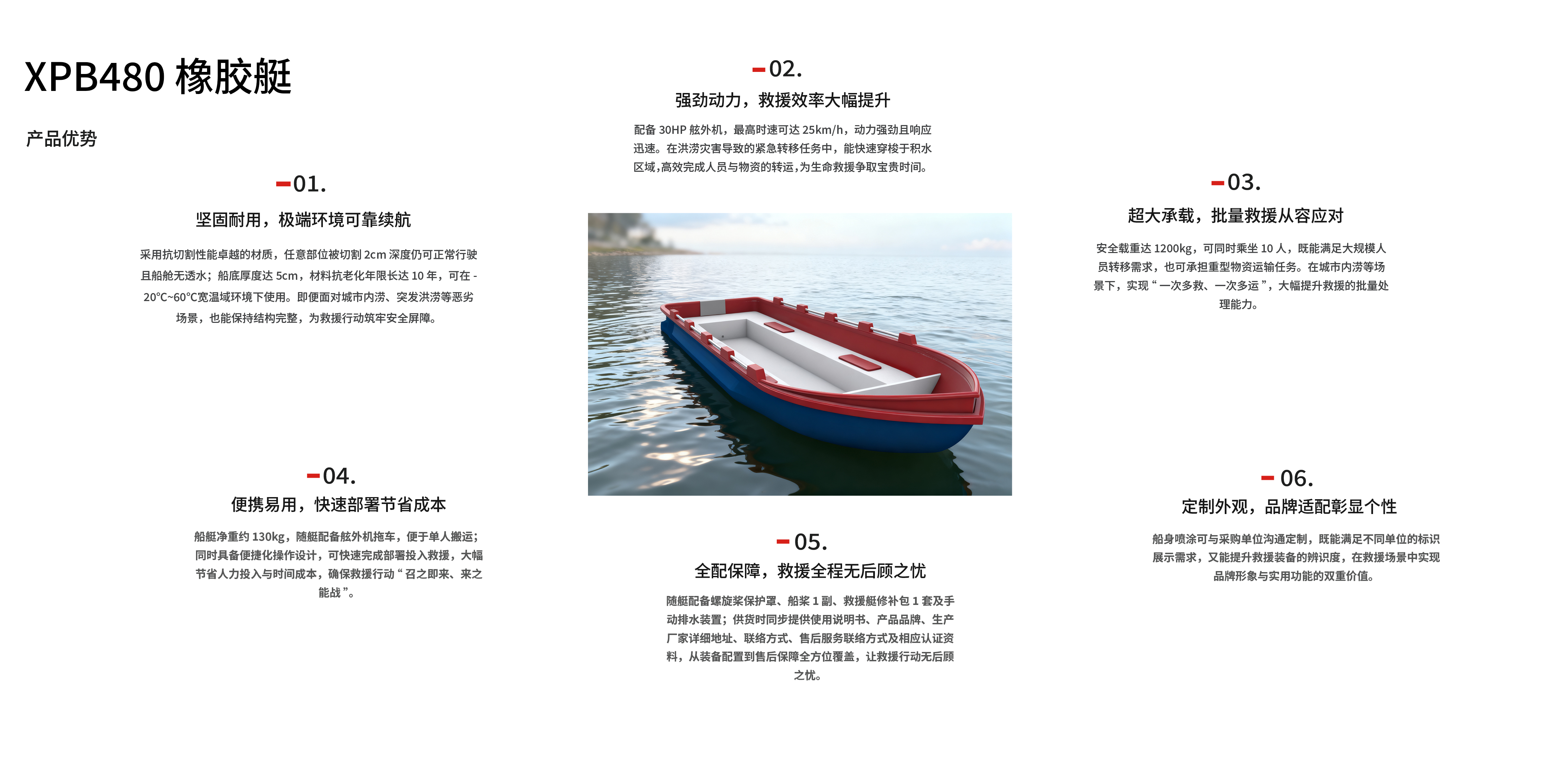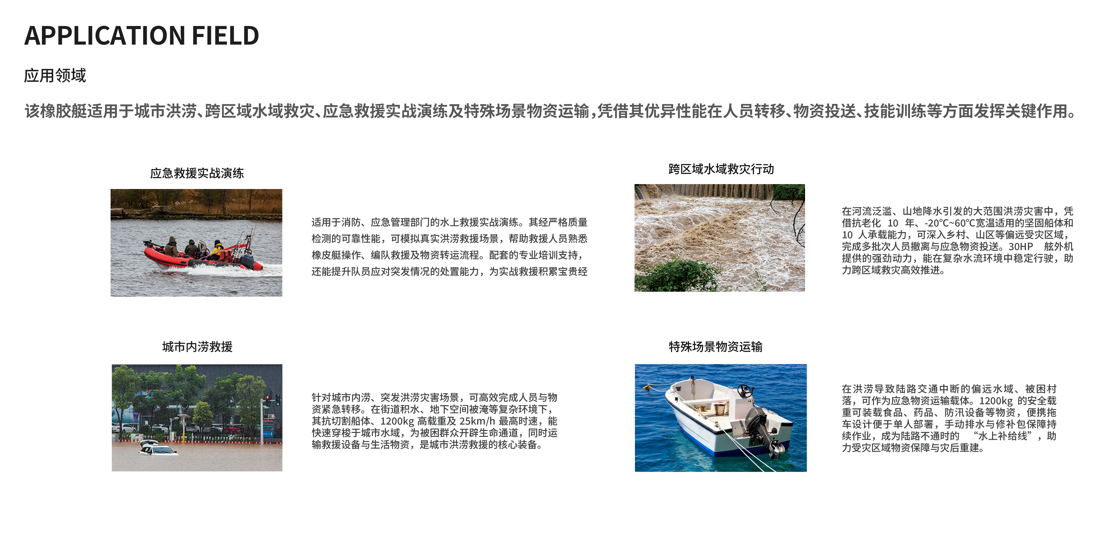 采用抗切割性能卓越的材质,任意部位被切割 2cm 深度仍可正常行驶且船舱无透水;船底厚度达 5cm,材料抗老化年限长达 10 年,可在 - 20℃~60℃宽温域环境下使用。即便面对城市内涝、突发洪涝等恶劣场景,也能保持结构完整,为救援行动筑牢安全屏障。