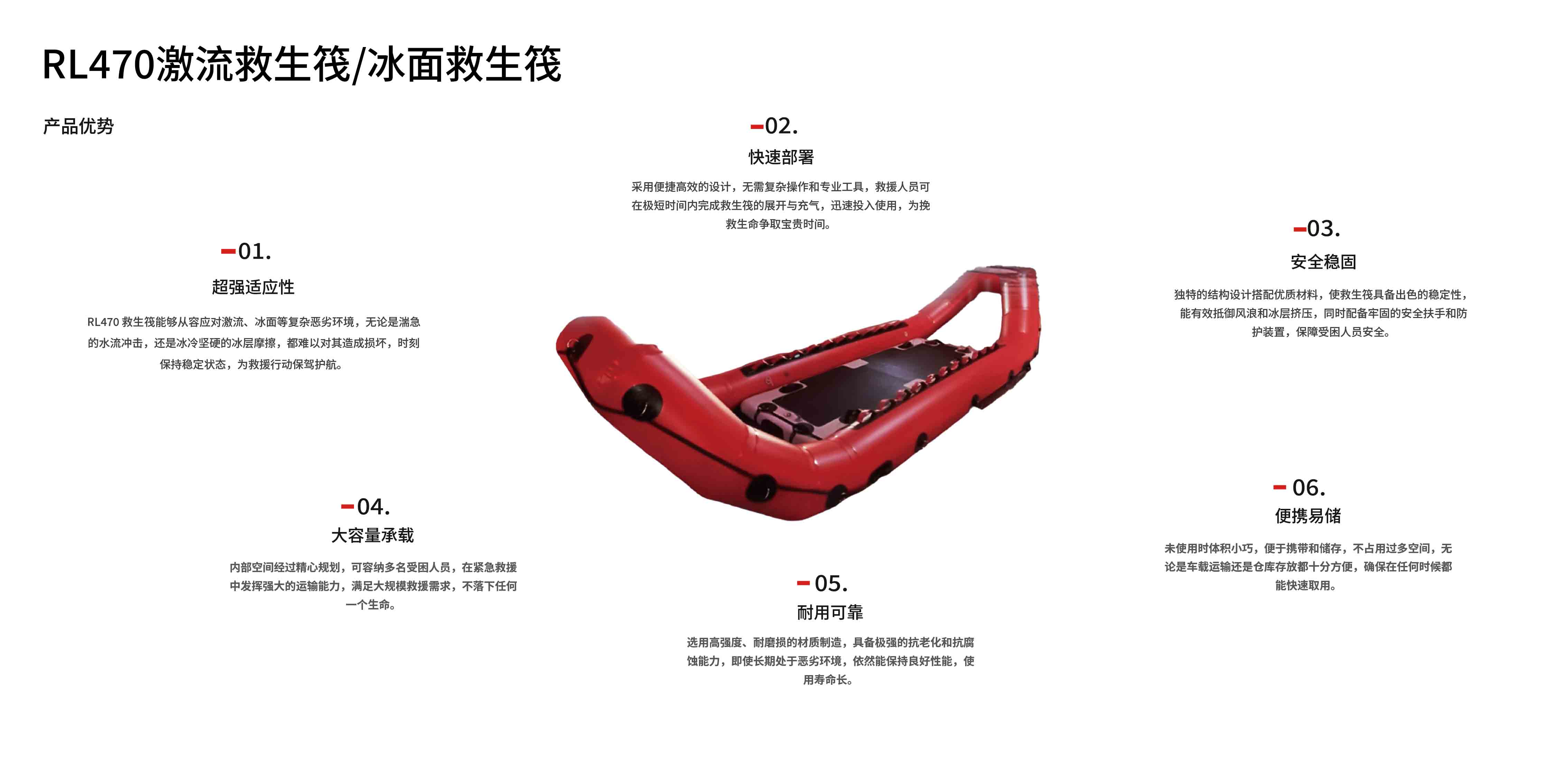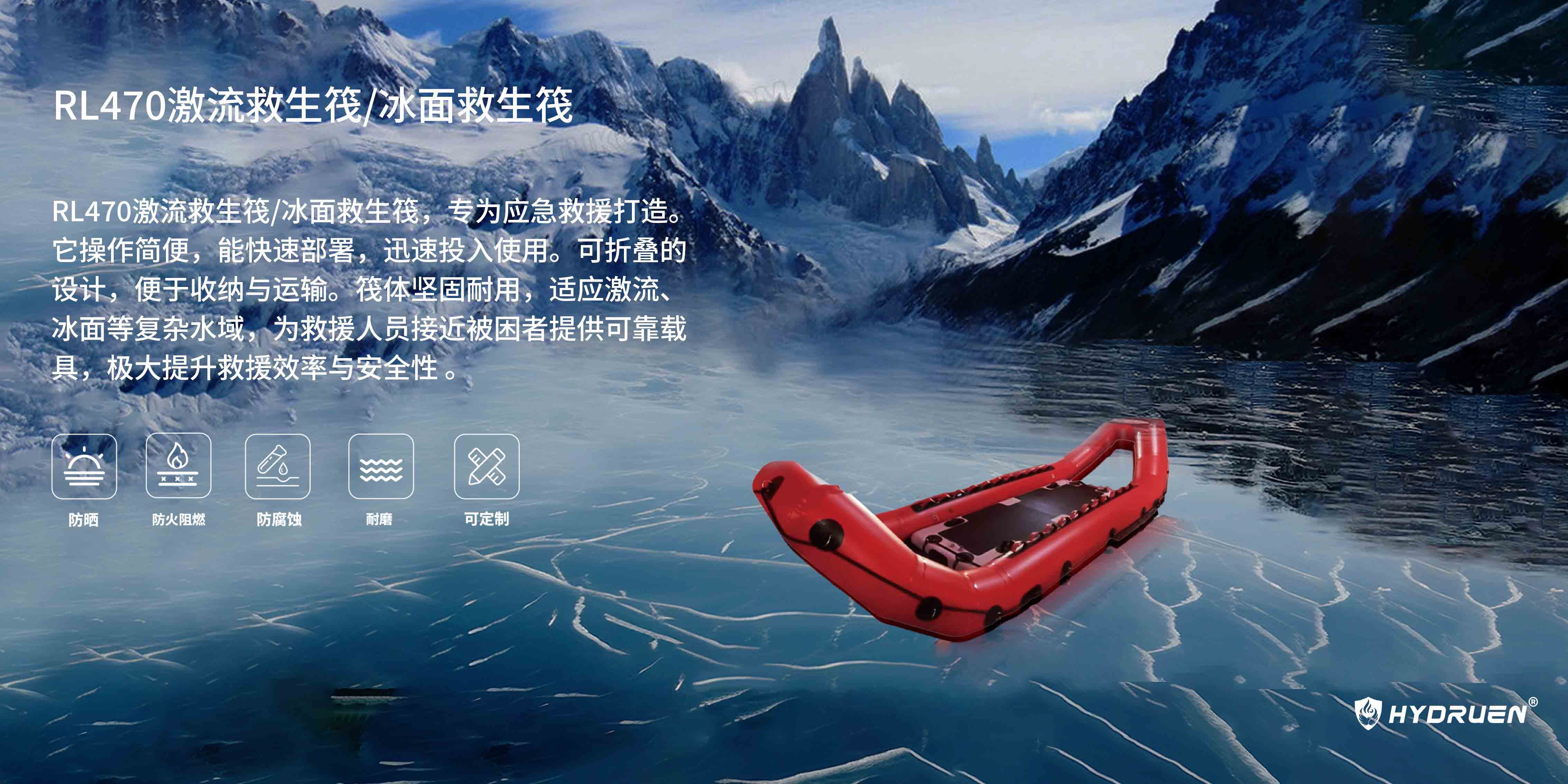 RL470 救生筏能够从容应对激流、冰面等复杂恶劣环境,无论是湍急的水流冲击,还是冰冷坚硬的冰层摩擦,都难以对其造成损坏,时刻保持稳定状态,为救援行动保驾护航。