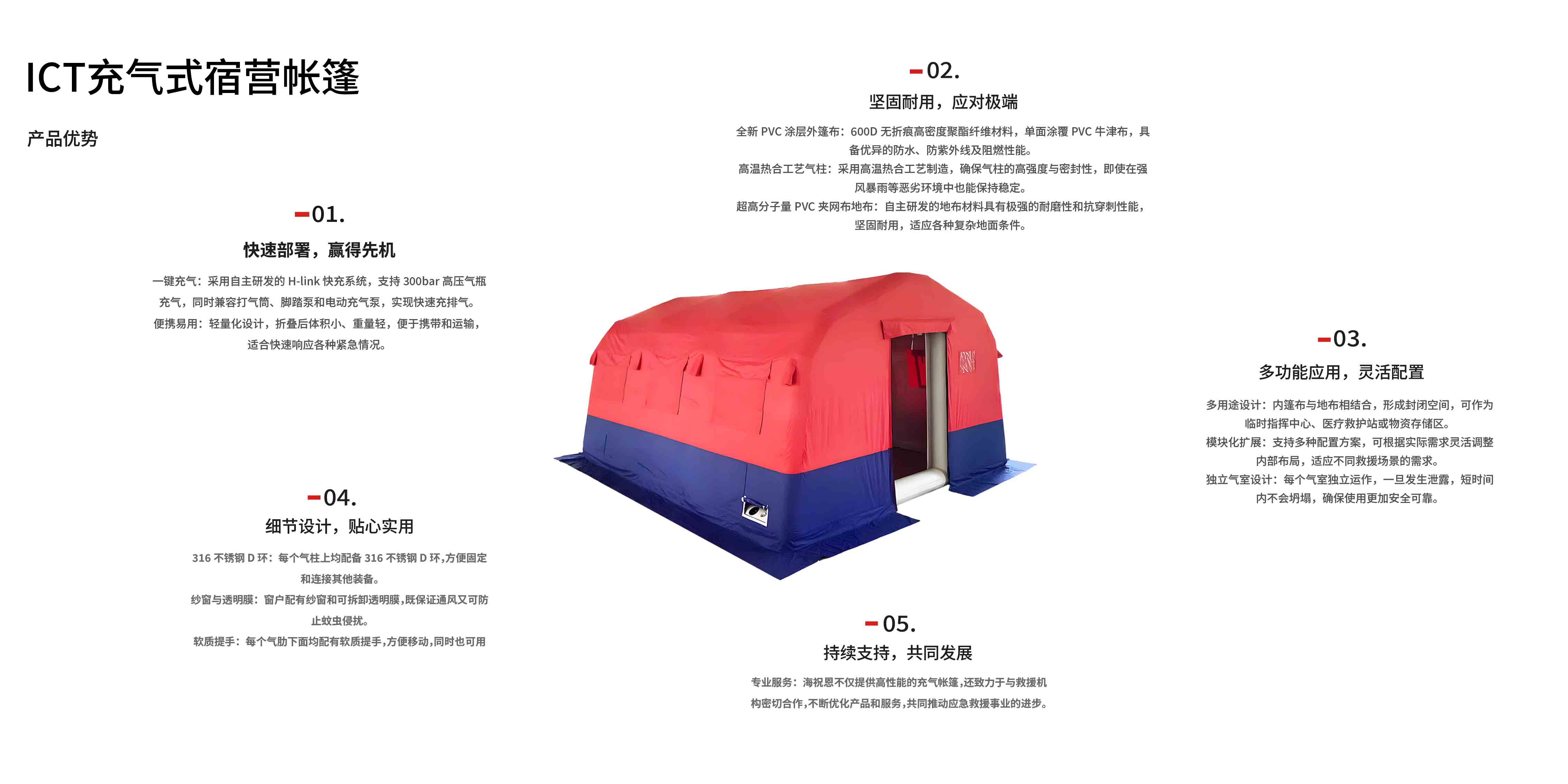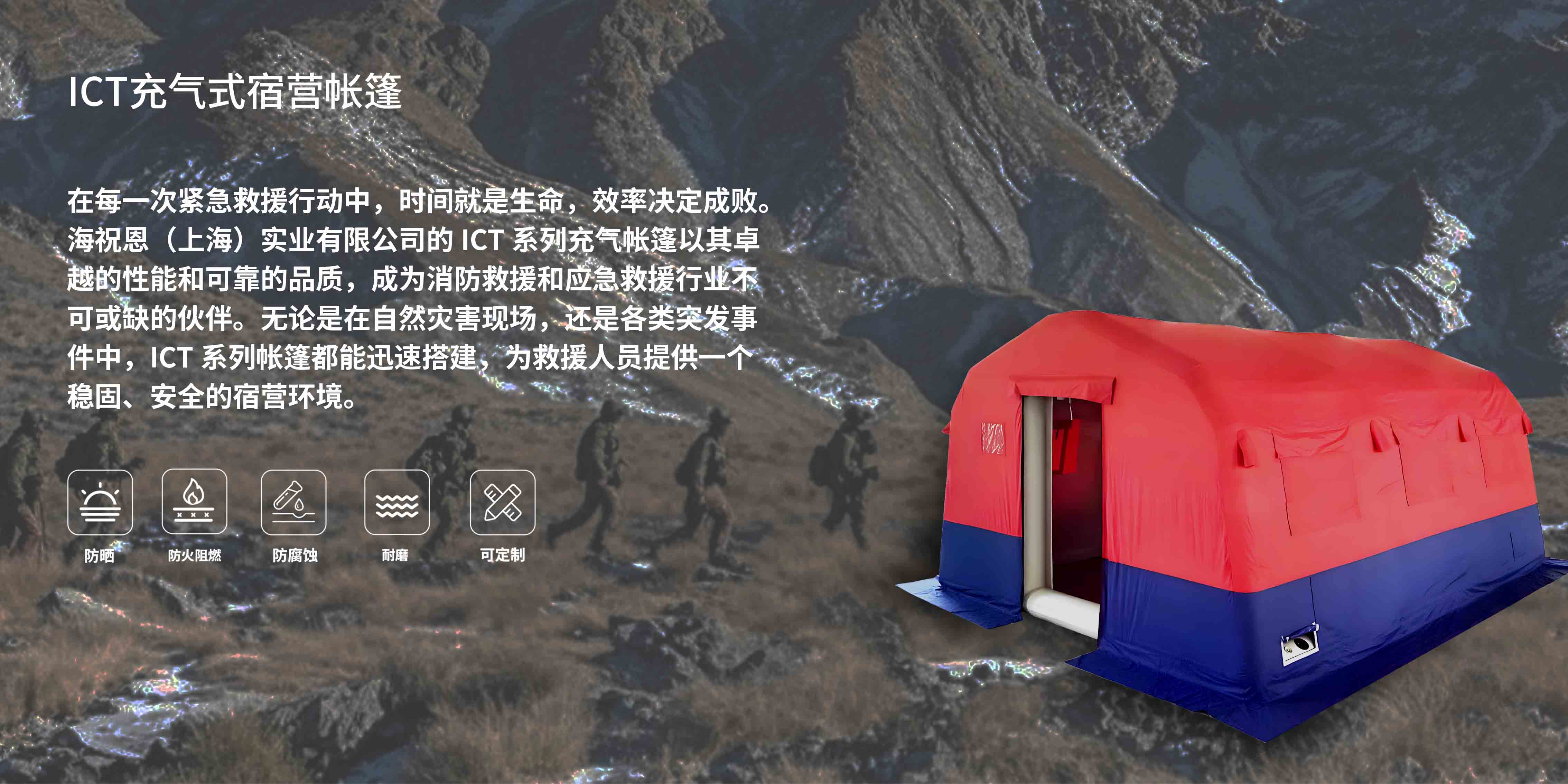 在每一次紧急救援行动中,时间就是生命,效率决定成败。 海祝恩(上海)实业有限公司的ICT系列充气帐篷以其卓 越的性能和可靠的品质,成为消防救援和应急救援行业不 可或缺的伙伴。无论是在自然灾害现场,还是各类突发事 件中,ICT系列帐篷都能迅速搭建,为救援人员提供一个 稳固、安全的宿营环境。