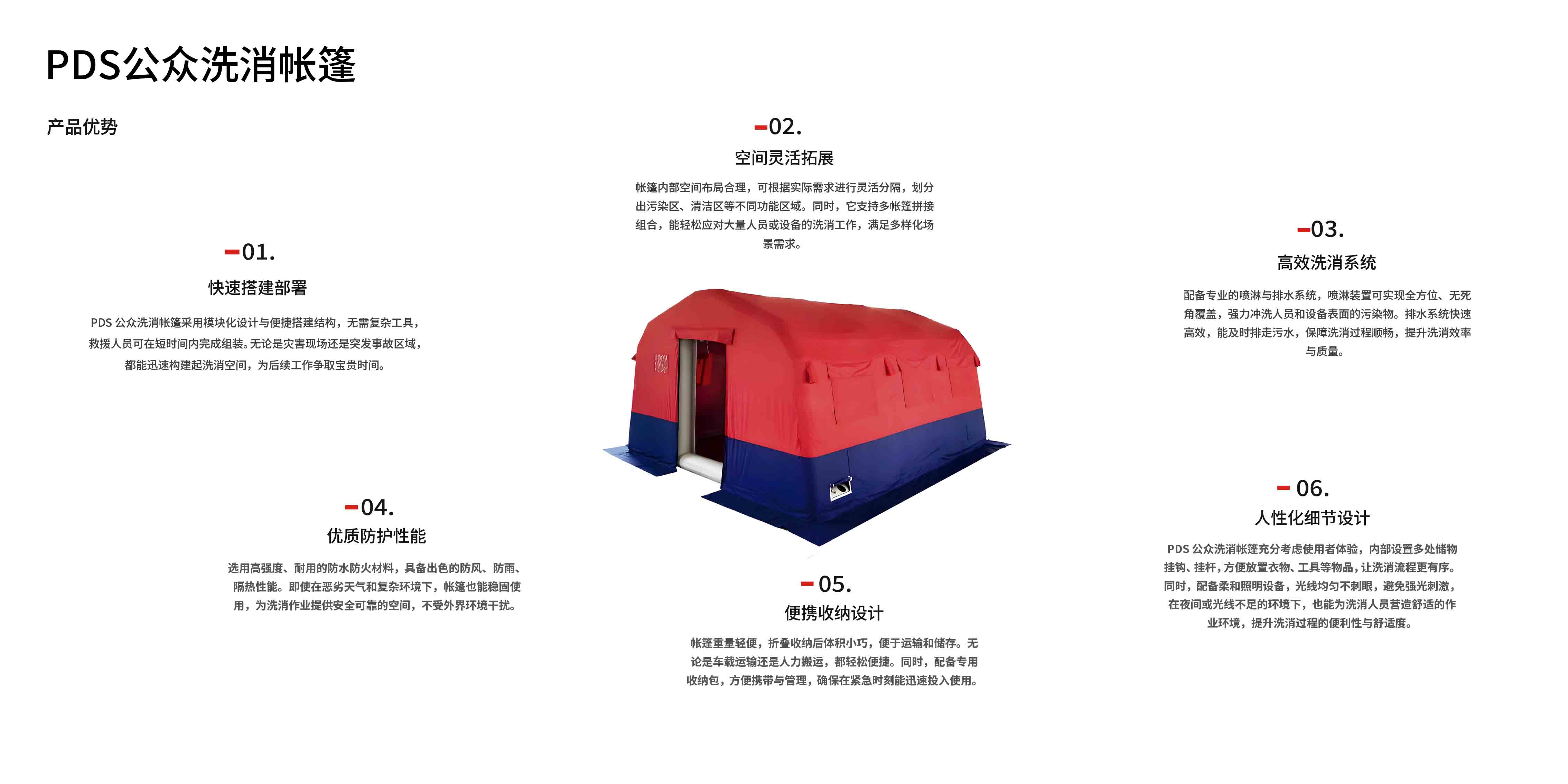 PDS公众洗消帐篷是专业应急洗消装备,结构 设计合理,搭建拆卸便捷,可快速构建洗消空 间。内部喷淋排水系统完善,能高效清除人员、 设备表面污染物,且防风防雨、隔热性好,适 应多种复杂环境,为紧急洗消作业筑牢可靠防线。