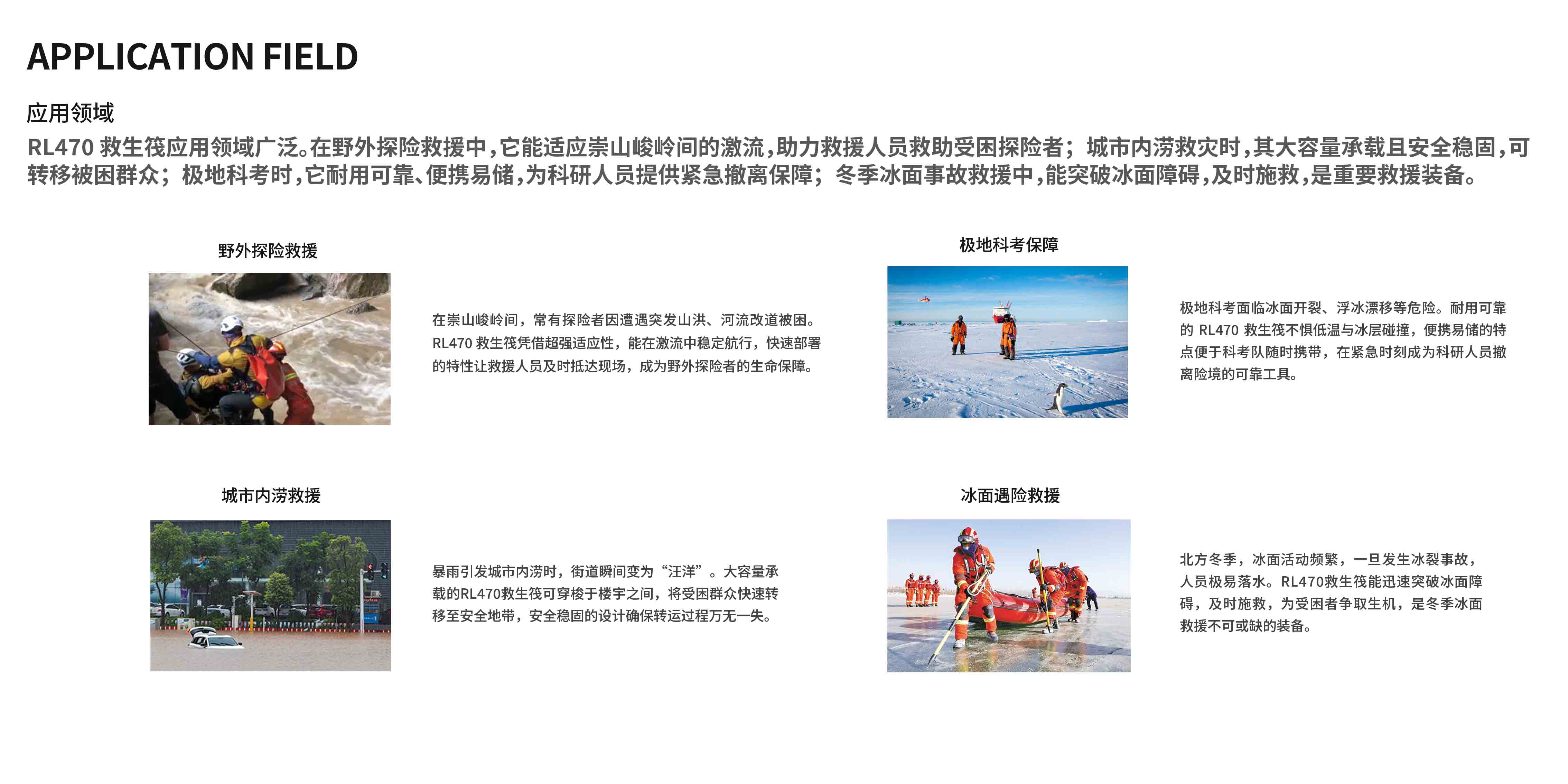 RL470 救生筏能够从容应对激流、冰面等复杂恶劣环境,无论是湍急的水流冲击,还是冰冷坚硬的冰层摩擦,都难以对其造成损坏,时刻保持稳定状态,为救援行动保驾护航。