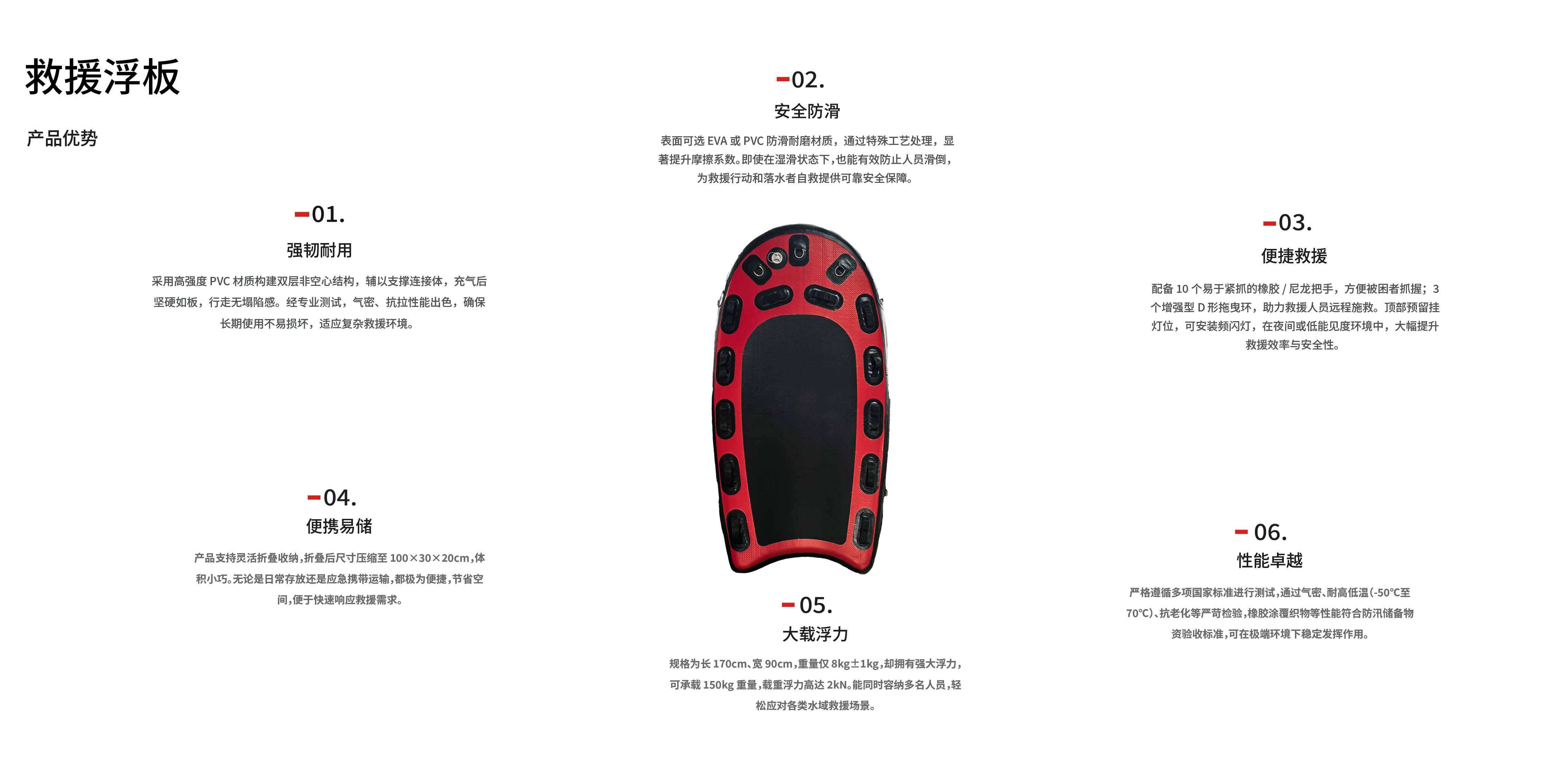 规格为长 170cm、宽 90cm,重量仅 8kg±1kg,却拥有强大浮力,可承载 150kg 重量,载重浮力高达 2kN。能同时容纳多名人员,轻松应对各类水域救援场景。
