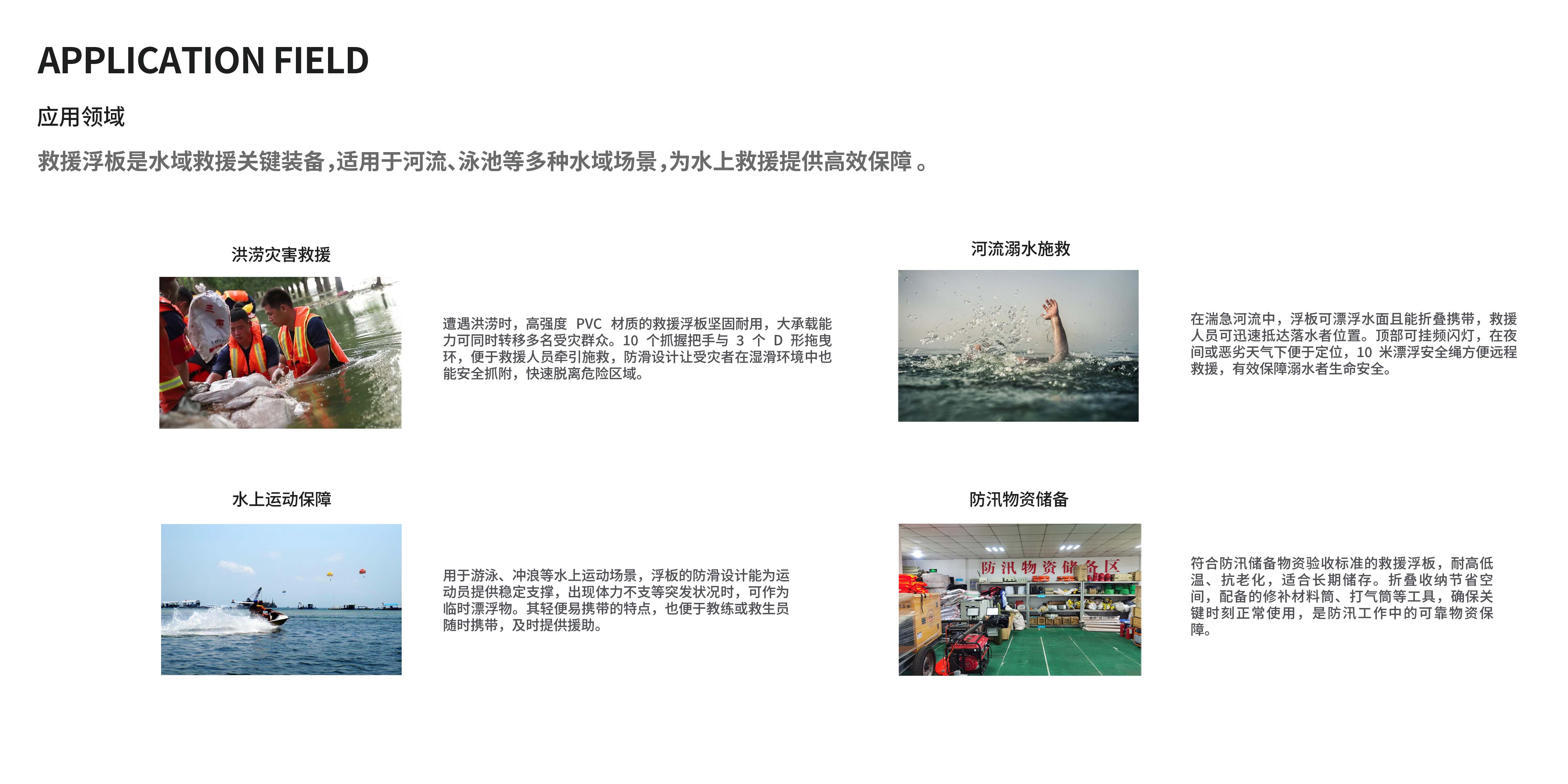 表面可选 EVA 或 PVC 防滑耐磨材质,通过特殊工艺处理,显著提升摩擦系数。即使在湿滑状态下,也能有效防止人员滑倒,为救援行动和落水者自救提供可靠安全保障。