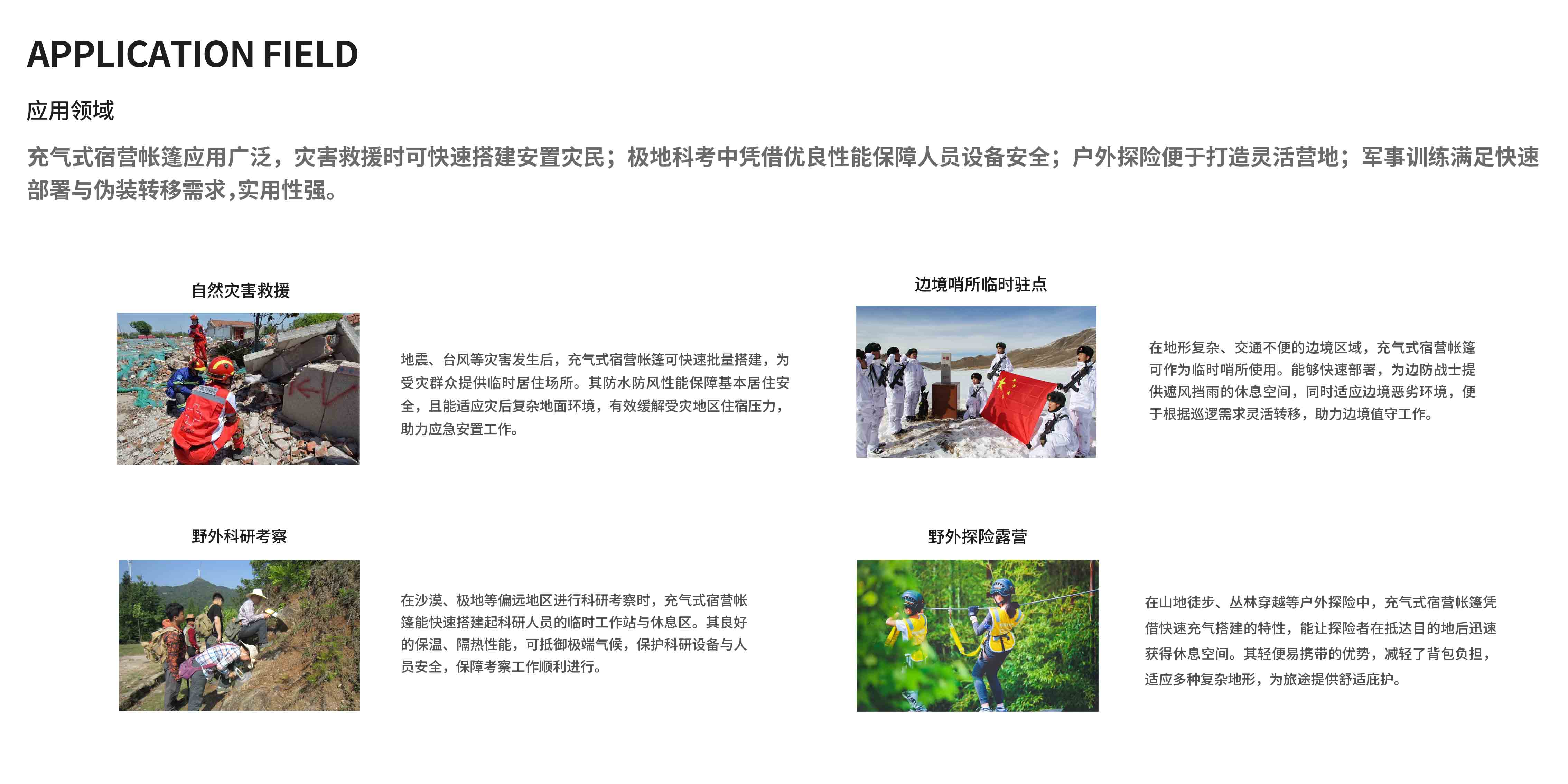 在每一次紧急救援行动中,时间就是生命,效率决定成败。 海祝恩(上海)实业有限公司的ICT系列充气帐篷以其卓 越的性能和可靠的品质,成为消防救援和应急救援行业不 可或缺的伙伴。无论是在自然灾害现场,还是各类突发事 件中,ICT系列帐篷都能迅速搭建,为救援人员提供一个 稳固、安全的宿营环境。